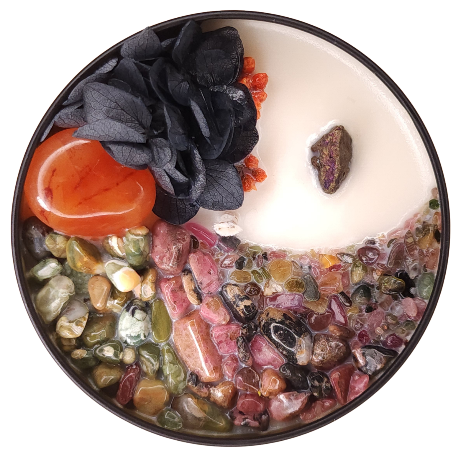 Crystals in candle include: Carnelian, Rhyolite, Rhodonite, Rainbow Tourmaline, Chalcopyrite