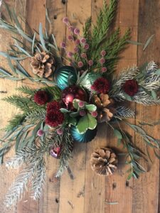 Festive holiday arrangements are designed with winter pine, berries, ornaments, spirited ornamental items, pinecones and ribbon in addition to fresh flowers. Style options are Earthy, Traditional or Wintery.